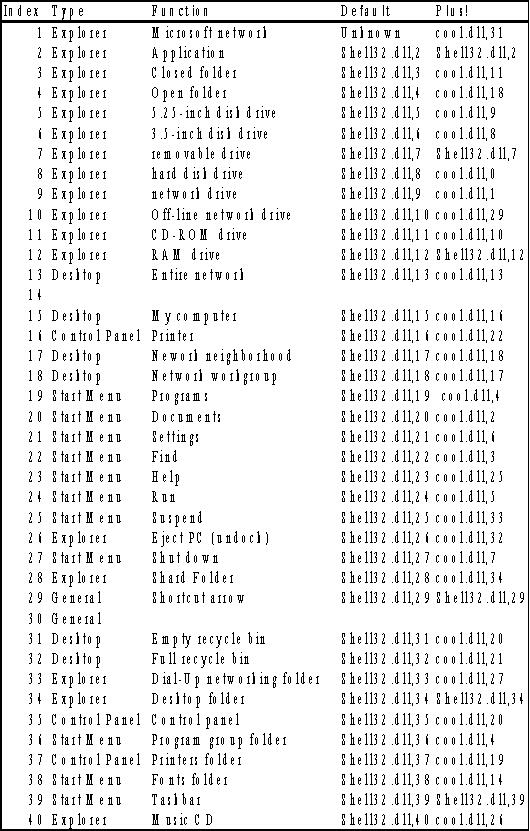 The above technique for the shortcut shell icon is also applicable to the other shell icons that Windows uses. In the following table the default icons used by Windows or by Microsoft Plus! are listed. Windows uses icons from the file SHELL32.DLL, while Microsoft Plus! mostly uses icons from the file COOL.DLL.