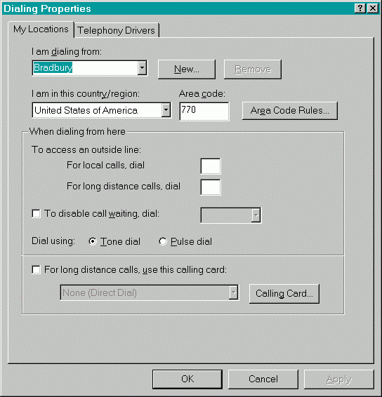Figure 11. Dialing Properties in the Telephony Applet of Windows NT