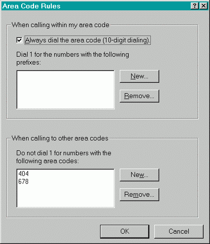 Due to the proliferation of cellular phones and second, and third, phone lines per household for Internet access, many areas in the country do no longer follow the simple rules of seven digit local phone numbers and one plus ten digit long distance phone numbers. The Telephony applet in Service Pack 4 for Windows NT and in Windows 98 allows you to define the area code rules applicable in your area. The Dialing Properties window of the Telephony applet is illustrated in Figure 11 and the Area Code Rules window is illustrated in Figure 12.