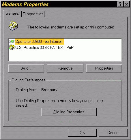 For Windows 95 the Dialing Properties are reached from the Modems applet in the Control Panel. It does not allow you to have ten digit local phone numbers or long distance phone numbers inside your area code. The Modem applet is illustrated in Figure 13 and the Dialing Properties window of the Modems applet is illustrated in Figure 14.