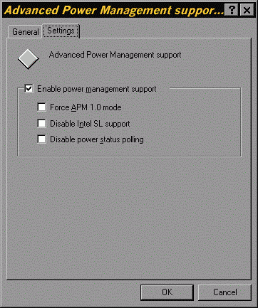 If Windows 95 does not recognize that your system supports APM features then the Advanced Power Management entry under Systems Devices will not appear. In that case there you cannot change any settings or enable APM. The Power applet in the Control Panel will not be displayed.