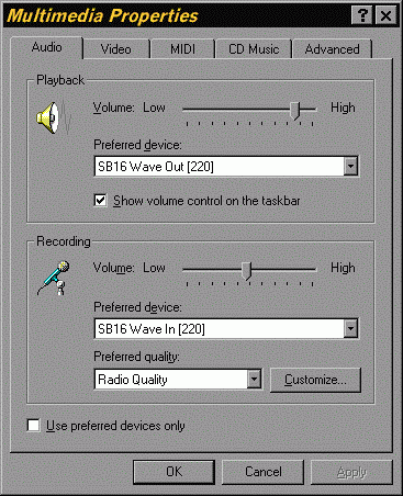 Sometimes an application causes the speaker icon to disappear from the right end of the Windows Taskbar. The display of the speaker icon can be controlled from the Multimedia applet in the Control Panel. Select the Audio tab and check the box Show volume control on the taskbar. The dialog box is illustrated in Figure 24.