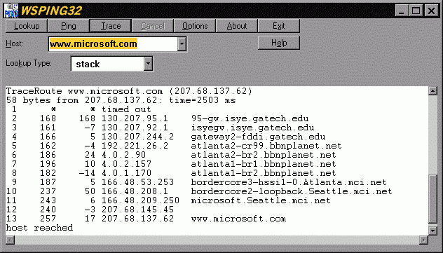 WSPING32 tracing the Microsoft web site is shown in the next figure.