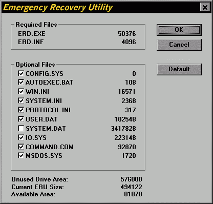 2. Run the Emergency Repair Utility by executing the ERU.EXE program. The program will overwrite all the information previously saved to the floppy with the current system information. The Emergency Recovery Utility is shown in Figure 26.