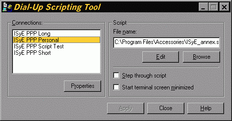 The Dial-Up Scripting Tool is also called Scripter after its file name SCRIPTER.EXE. In the original version Dial-Up Networking the script file was attached with the dialog window shown in Figure 3.