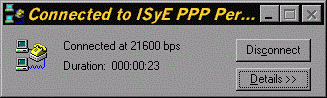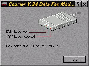 The original version of the Dial-Up Networking utility displayed the status of the active connection in a window and with a modem icon in the tray area, with lights flashing to indicate data sent and received. An example of this window is shown in Figure 1. Opening the modem icon displays a larger window that reports the number of bytes sent and received during the current session. An example of this window is shown in Figure 2.