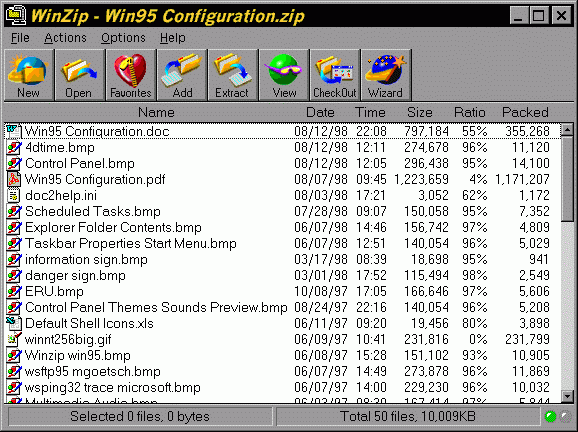 A ZIP file is a compressed archive of a set of files. Archives are files that contain other files. Typically the files in an archive are compressed. Archives usually have file names ending with CAB, ZIP, LZH, ARJ, or ARC, depending on how they were created. Archives make it easy to group files and make transporting and copying these files faster. Compressed archives also reduce the space required to store a set of files on a hard disk or floppy disk. ZIP is the default extension of zipped files. WinZIP by Nico Mak is a popular utility with GUI interface to manipulate ZIP files. A typical window for WinZIP is shown in the next figure.