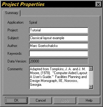 The project title and other project information can be changed with the Properties command of the File menu. The properties of the tutorial project are illustrated in Figure 2.6.