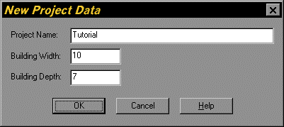 Select the New command from the File menu or press the New button on the toolbar. The New dialog window will be shown. The New dialog window for this project is illustrated in Figure 2.1. Enter a project name with a maximum of 63 characters. Only letters, digits, spaces, and underscores are allowed in the project name. Enter the building width and building depth of the rectangular building. The building width and depth are displayed horizontally and vertically on the screen, respectively. For this tutorial project, enter "Tutorial", ten, and seven for project name and building width, and depth, respectively. Press OK and a new project without any departments will be created.