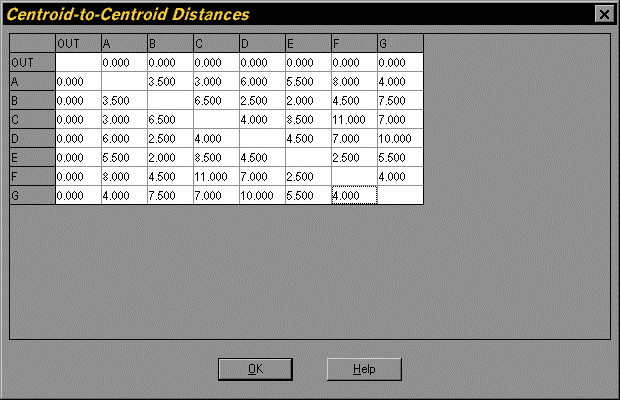 You can also display the individual centroid-to-centroid distances between each pair of departments with the Display Distances command of the Algorithms menu. The Display Distances dialog window will be shown as is illustrated in Figure 2.23. You can also display the product of the flow distance multiplied by the flow intensity between every pair of departments with the Display Flow-Distance Cost command of the Algorithms menu.