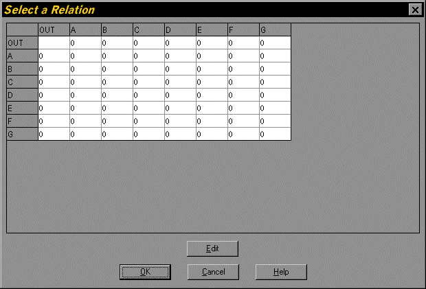 At this time, we will enter all the affinities between departments or relationships to the project. Select the All Relations command from the Edit menu. The Select a Relation dialog will be shown, which displays the relations in a two dimensional array. The initial Select a Relation dialog is shown in Figure 2.11. Initially all relations will be zero. Edit the relation between two departments by clicking on the corresponding element in the array. You can also move the cursor to the desired relation with the arrow keys and click the Edit button or press the Alt-E key.