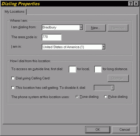 For Windows 95 the Dialing Properties are reached from the Modems applet in the Control Panel. It does not allow you to have ten digit local phone numbers or long distance phone numbers inside your area code. The Modem applet is illustrated in Figure 13 and the Dialing Properties window of the Modems applet is illustrated in Figure 14.